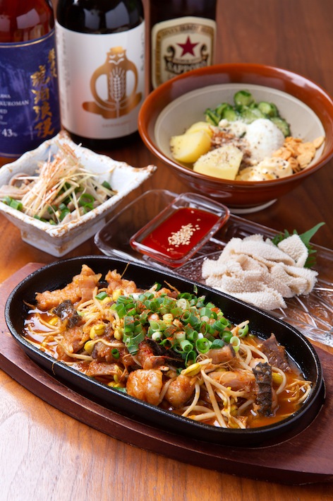 鉄板焼きを中心に、お酒に合う一品料理をリーズナブルに味わえる「酔い処 銕(くろがね)」。オリジナルの味噌ダレに漬けた新鮮なシマチョウ、センマイ、ハチノスなどをミックスしたホルモンの鉄板焼きは、一口ごとに違う歯ごたえを楽しめる。正方形の平たい鍋で味わう、大阪発祥のチリトリ鍋は、暑い日に汗をかきながら味わうのもおすすめ。佐久の地酒などアルコールも豊富で、「ふらっと気軽に入って頂いてワイワイと楽しんでほしいですね」と土屋店長。