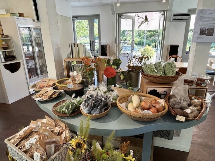 レイクニュータウン内にこの6月オープンしたグローサリー&カフェ。店内には、日本各地の小規模生産者から届く無添加の野菜や食材が並び、「カフェでは主に、販売する食材の美味しさを伝えるためにシンプルなメニューを提供しています」と店主の高橋さん。早くもリピーターがいるほど人気の4種のホットドッグや手揚げドーナツのほか、1週間塩漬けにした蓼科豚と季節の野菜を煮込んだ滋味あふれるポトフがおすすめ。高齢化の進む同エリアの別荘住民にも、近くで上質の食料品が手に入ると重宝されている。