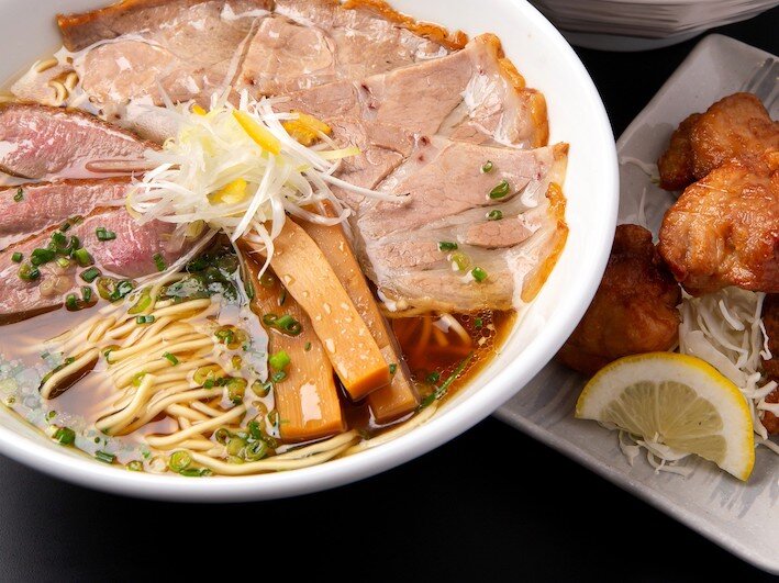 特製鴨だし醤油チャーシュー麺(1800円)、信州福味鶏の唐揚げ(750円)