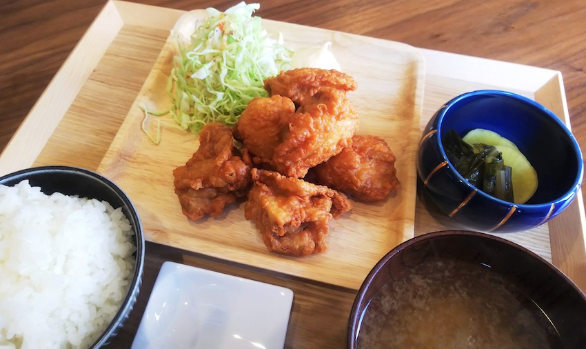 「唐揚げ定食」880円。揚げたての大きな唐揚げ6個に千切り野菜、ごはん、みそ汁、小鉢付き。 軽井