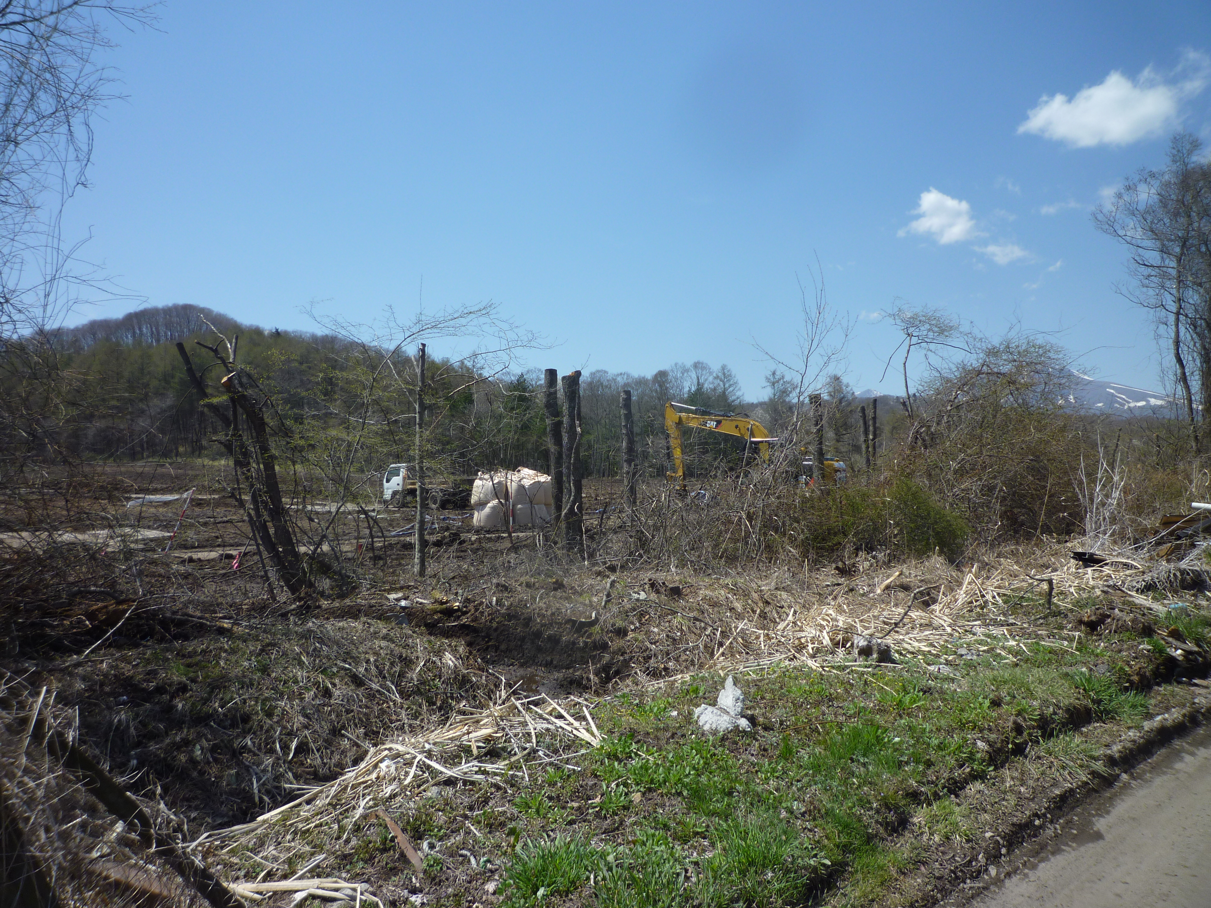 4月23日、現地へ行ってみると、道路に沿った木々はすっかりなくなっていた。わずか数本残った木も高さ2mくらいのところでバッサリ切られている。軽井沢新聞が行ったアンケート調査に対して「『3万坪の樹木が切られ』というのは間違いだ。敷地境から10m後退する所は木を切らない」と怒鳴った自然保護審議会の委員がいたが、一目瞭然、すっかり木が切られたことはひと目でわかる。生活環境課の担当者(事務局)にこの写真を見せると、「太陽光発電なので、太陽光が必要な部分は切ったとしてもやむを得ない。10m後退の部分はなるべく木を残すように協議はした」と説明する。しかし、そこには切り株が幾つも残っていた。