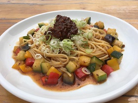 パプリカ、ズッキーニ、ナスなど夏野菜を使った冷たいパスタ。ドンと上にのった肉味噌が鬼出し岩をイメージしてインパクトがある。ジャジャー麺のような肉味噌は甘めで辛くないので子供も食べられる。1100円