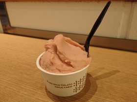 永井農場で収穫したトマトとバジルを使用。ミルクは使わず、トマトをまるごとミキサーにかけて作る。トマトの香りとバジルの香りが口の中にフワッと広がる爽やかなジェラート。シングル400円。