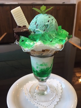 まるで宝石箱のようなミントづくしのパフェ。チョコミントアイスの下には手作りのミントゼリーやミントババロアが生クリームやチョコレートシロップに包まれている。チョコブラウニーも添えてあるので、食べ応えも十分。780円
