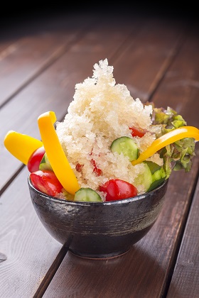ひんやりかき氷のサラダは、トマトやキュウリなど新鮮な信州高原の野菜に、和風だしの氷がのった新感覚のサラダ(500円)。さらっとした中に旨味を味わえる。10:00~18:00
