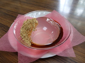 軟水のおいしい水を、ギリギリの硬さで冷やし固めた寒天ゼリー。黒蜜ときなこをかけていただく。透明で丸いゼリーは柔らかな食感で清涼感が広がる。持ち帰りもできるが、型から出すとすぐに緩んでしまうので、店内のイートインスペースで味わうのがベター。400円