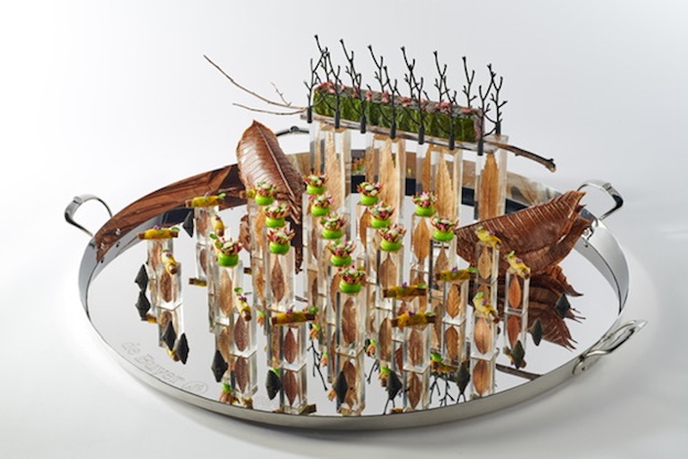 プラッターの肉料理は軽井沢の森の中をイメージして、お皿に盛り付けたときは、朴葉をかたどったフランスの焼き菓子「チュイル」で全体を隠し、それをどけると森の一部が現れるイメージですね。
