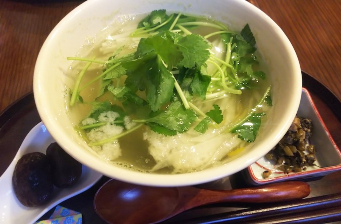 風味豊かなだし汁に、三つ葉と細切り大根、エビや鶏肉、栗などの具材を包み込んだ柔らかなお餅が入っている。日によって変わる箸休めの小皿付き。珈琲セットのみ。1,500円。