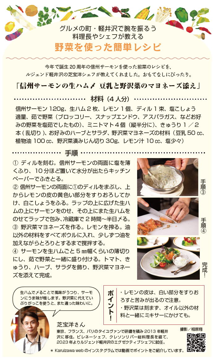 【野菜を使った簡単レシピ】信州サーモンの生ハム〆 豆乳と野沢菜のマヨネーズ添え
