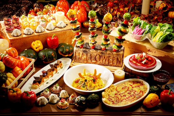 「ハロウィーンディナーブッフェ」。お化けの顔のようにデコレーションした「おばケーキ」などがずらり。