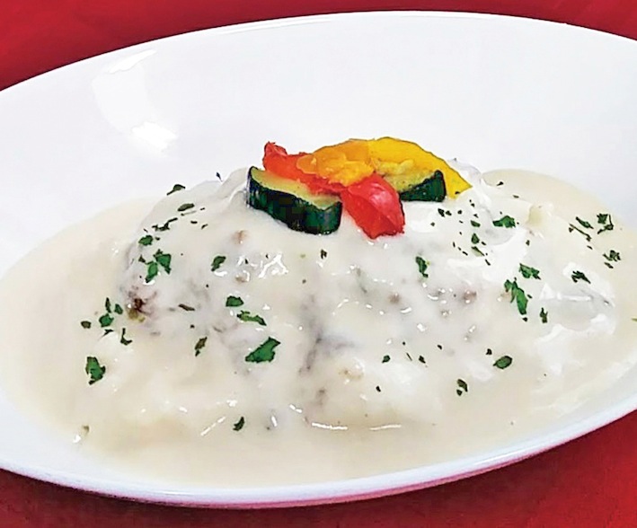 白いドライカレーライス作家の内田康夫さんが愛したサフランライスのドライカレーの上に、チーズを混ぜた
