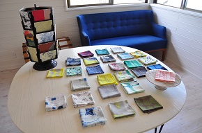 グッズは「ラッタラッタル」のブランド名で販売。サインペンやアクリル、水彩などで描いたデザインをデータ化してコラージュ。ハンカチ(30種、各2700円)やポストカード(12種、各162円)にして販売している。ジャガード織りの靴下やスカーフ、機織りで制作したラグやタペストリーも、これから販売予定。初日に訪れた町内の女性は「どれも素敵なデザインで選ぶのが迷う」と好評だ。
