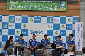 山口剛史選手は五輪の目標について「初めての出場だが、一番を狙っていきたい」。宮嶋さんは、40年間スポーツ取材を続けてきた経験から「スポーツに大切なことは環境。軽井沢には、思わずカーリングしたくなるような施設があって、教えてくれる人も間近にいる。こんなに揃っている所はない」と話した。