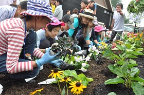 オープン当日は、フラワーアクティビストの志穂美悦子さんや、軽井沢の小学生など約40人が参加し、ガーデンの柵にかけるハンギングバスケットを製作。様々な花の苗80株もガーデン入口に植えた。