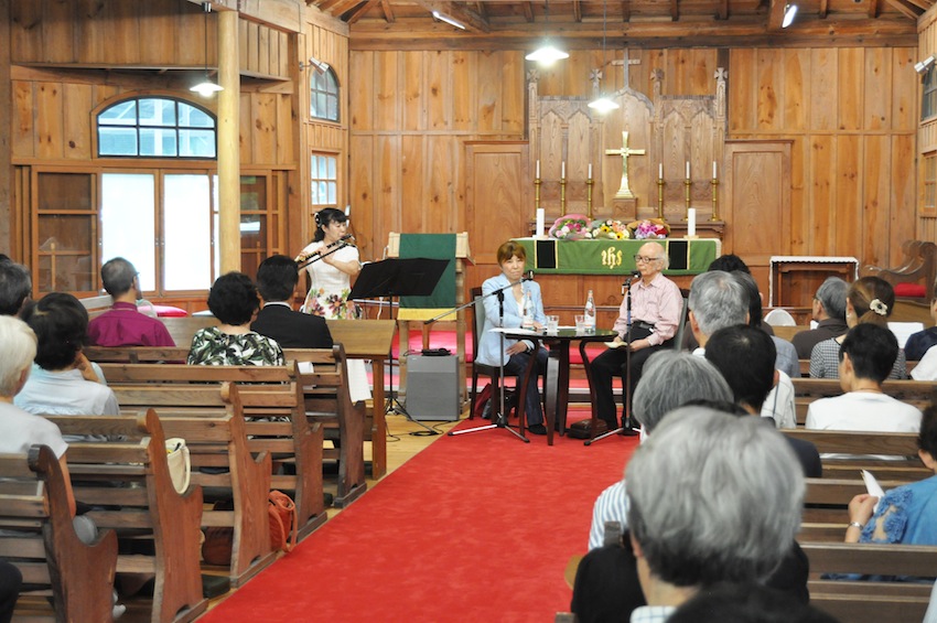 軽井沢を築いた先人を讃える「第20回軽井沢ショー祭」は雨のため、ショー記念礼拝堂内で開催。作家の加賀乙彦さんと朗読家の青木裕子さんの対談や、フルート演奏も行われた。祭典が終わる頃には雨が上がり、多くの人がショーの銅像に献花していた。
