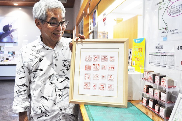 (スタンプの製作者、野口和信さん。スタンプの多くは人に贈っているので、色紙などに押して図柄を残している。)