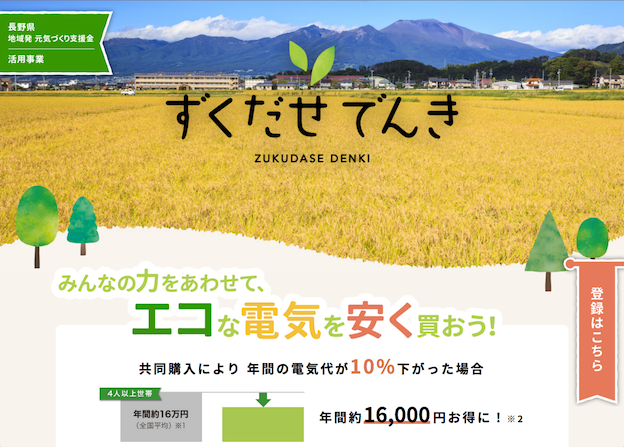 住民グループ「軽井沢ハルニレ・グリーン・クラブ」が、安くて環境にやさしい自然エネルギー100%の電気を共同購入するプロジェクト「ずくだせでんき」を進めている。佐久地域(佐久市・小諸市・北佐久郡・南佐久郡)の個人、法人を対象に登録者を募集。風力、太陽光などの自然エネルギーを提供する電力会社(10社ほど)を集めたオークションを行い、最も安値を出した会社を選定する。オークションの結果を見て、電力会社を切り替えるかどうかは個々の自由。安くなった分の料金は、イオンの電子マネー「ワオン」に還元する。登録人数が多いと、まとまった契約数に繋がるため、電力会社側もより安い料金設定ができるという。