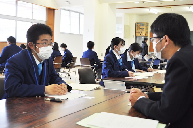 5月17日、生徒10人が企業担当者と初めて顔を合わせ、業務で身につける制服のサイズや持ち物などを確認した。今年生徒を受け入れるのは、町内の沢屋、長岡鉄工、白樺堂、軽井沢町振興公社、草軽交通のほか、小諸市の小諸村田製作所、OKIハイテックの7社。