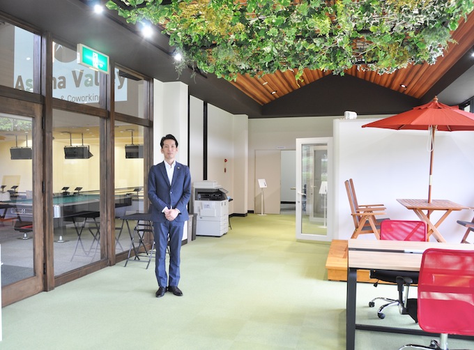 (ワークスペースに立つ庄司社長。デスクは屋内に20席、屋外に10席。屋外にはハンモックも設置し、寛げるようにした。)