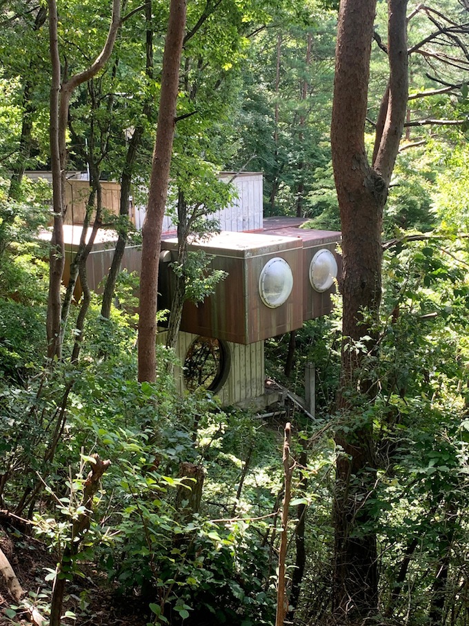 御代田町にある故黒川紀章氏設計の「カプセルハウスK」。現在解体中の中銀カプセルタワービル(東京都)と同じタイプのカプセルを使用した建築史的にも貴重な建物だ。メタボリズム建築の可能性を示すために作られたモデルハウスで、1973年に個人の別荘タイプとして建てられた。この建築空間を体感し配信する試みが、9月11・12日に舞踊史研究家の芳賀直子さんや音環境デザイナーの庄野泰子さん、コピーライターのマエキタミヤコさんらにより行われた。