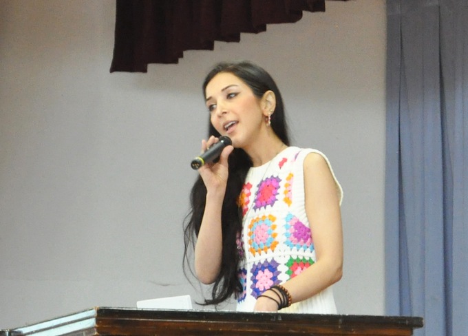 軽井沢高生に向け語りかける、サヘル・ローズさん。