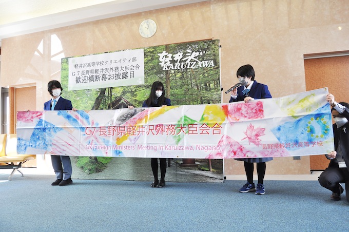 軽井沢高校クリエイティ部が制作した、G7外相会合の歓迎横断幕が3月16日、お披露目され、軽井沢駅自由通路の北口に掲げられた。横断幕は縦70cm、横5m。3年生が描いた原案をもとに、2年生の清水優那さん、横田宥璃奈さん、1年生の遠山天さん、横内雄真さんが仕上げた。日本伝統の帯に見立てたG7参加国の国旗と、新緑の雲場池を両面にそれぞれ描いた。部長の清水さんは「横断幕を見た人が、世界の平和について考えてもらうきっかけになれたら嬉しい」。この日は、歓迎準備を進める町民会議のメンバー、軽井沢高校アイスホッケー部員が、駅南側を中心にごみ拾いも行った。