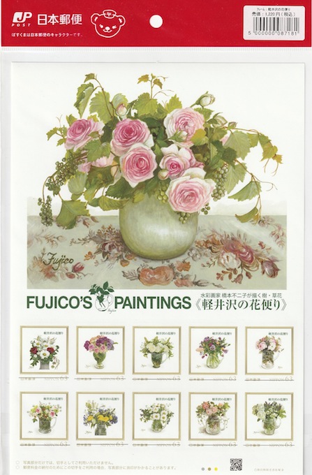 浅間山麓の草花を描く水彩画家、橋本不二子さんの作品がフレーム切手になり、軽井沢町内の4郵便局で販売されている。63円切手10枚セットの「軽井沢の花便り」(1220円)と84円切手10枚セットの「軽井沢のグリーン」(1330円)の2種類。「軽井沢ならではのお土産がほしい」という観光客らの声に応え、軽井沢郵便局販売部から橋本さんに依頼し制作した。