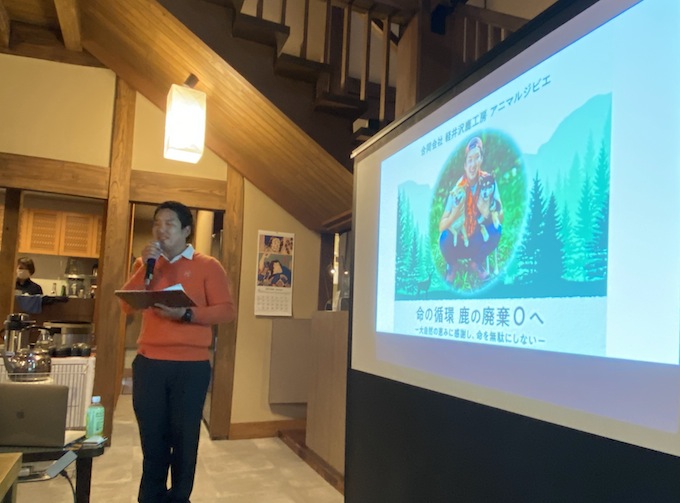 食事の前に鹿の現状や課題についてレクチャーする菊地哲也さん。長野県認定管理捕獲技術者でもある。