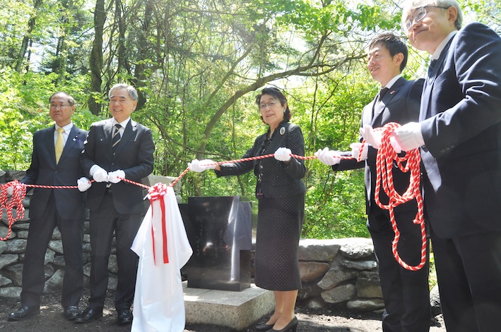 戦中戦後を軽井沢で過ごした作家正宗白鳥(1879〜1962)の文学碑が、旧軽井沢北部の山中から、雲場池近くの白鳥の旧別荘敷地の一角に移設され5月16日、除幕式があった。多くの人に見てほしいという、遺族の意向を踏まえ町が移設した。