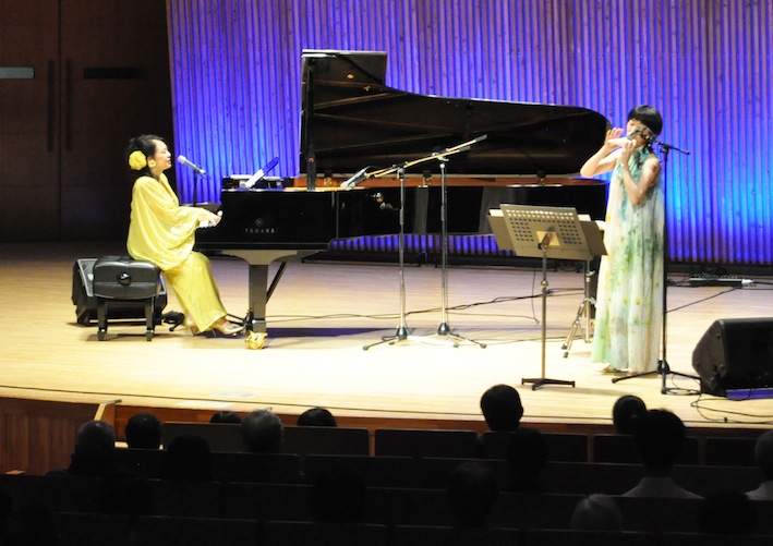 ピアノを弾き語るマキさんと、オカリナ奏者のホンヤさん。