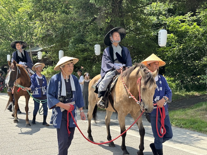 追分馬子唄を歌いながら、追分宿を江戸時代の装いで練り歩く「しなの追分馬子唄道中」が7月23日に行われた。コロナ禍で3年間実施されず、4年ぶりの開催となった。快晴に恵まれた追分宿や浅間神社には、出店などが立ち並び、多くの人でにぎわった。