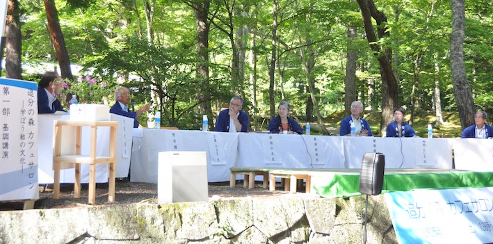 追分宿郷土館は8月26日、追分地区の魅力について発信する「追分の森カフェサロン」を追分公園で開いた。町制100周年記念事業の一環として、中山道に関する講演や追分を愛する人たちによるシンポジウムを行い、約100人が集まった。