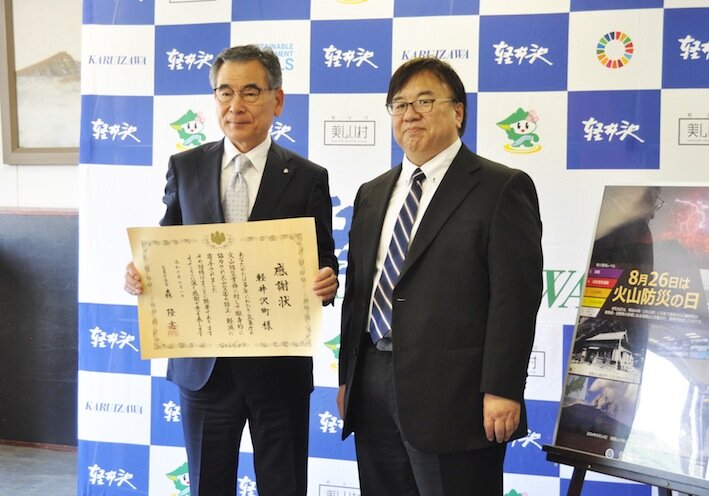 気象庁の火山防災業務に多年にわたり協力したとして、軽井沢町が気象庁長官表彰を受けた。6月12日、長野地方気象台の池田秋央台長から土屋町長へ伝達。1923年に浅間火山追分観測所(のちの軽井沢測候所)が設置されてから続く業務連携、防災教育などの功績が評価された。町長は「雄大な姿が多くの人を魅了する一方で、いざ噴火したら多くの被害をもたらす」とし、引き続き連携した火山災害の防止、軽減への協力を求めた。