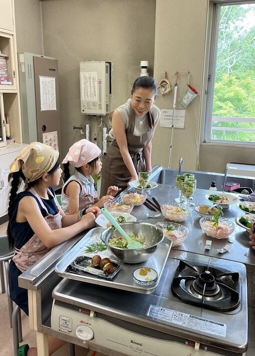 軽井沢在住で日本料理家の藤田貴子さんが、7月26日、中央公民館で親子で作る和食教室を開催した。小学校低学年から高学年までと保護者ら14名が参加し、梅ダレそうめん、蟹とアボカドの白和え、蒸し鶏と夏野菜の胡麻和えの三品を調理した。「鯛のお刺身を柵から引く練習をしたら、とても上手で吸収が早い。家では出汁を取ることが減っているので、出汁を取る工程を見せたら、親御さんの方が興味を持っているようでした」と藤田さん。次回は春休みに合わせて3月29日に、ちらし寿司と桜餅を作る予定。