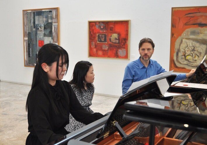 ドイツ人ピアニストで、ベルリン芸術大学ピアノ科教授のマルクス・グローさんが講師を務めた。洋画家脇田和の名画に囲まれた2階メインギャラリーにピアノを2台並べ、音大などに通う19~25歳の9人が期間中、計3回の指導を受けた。