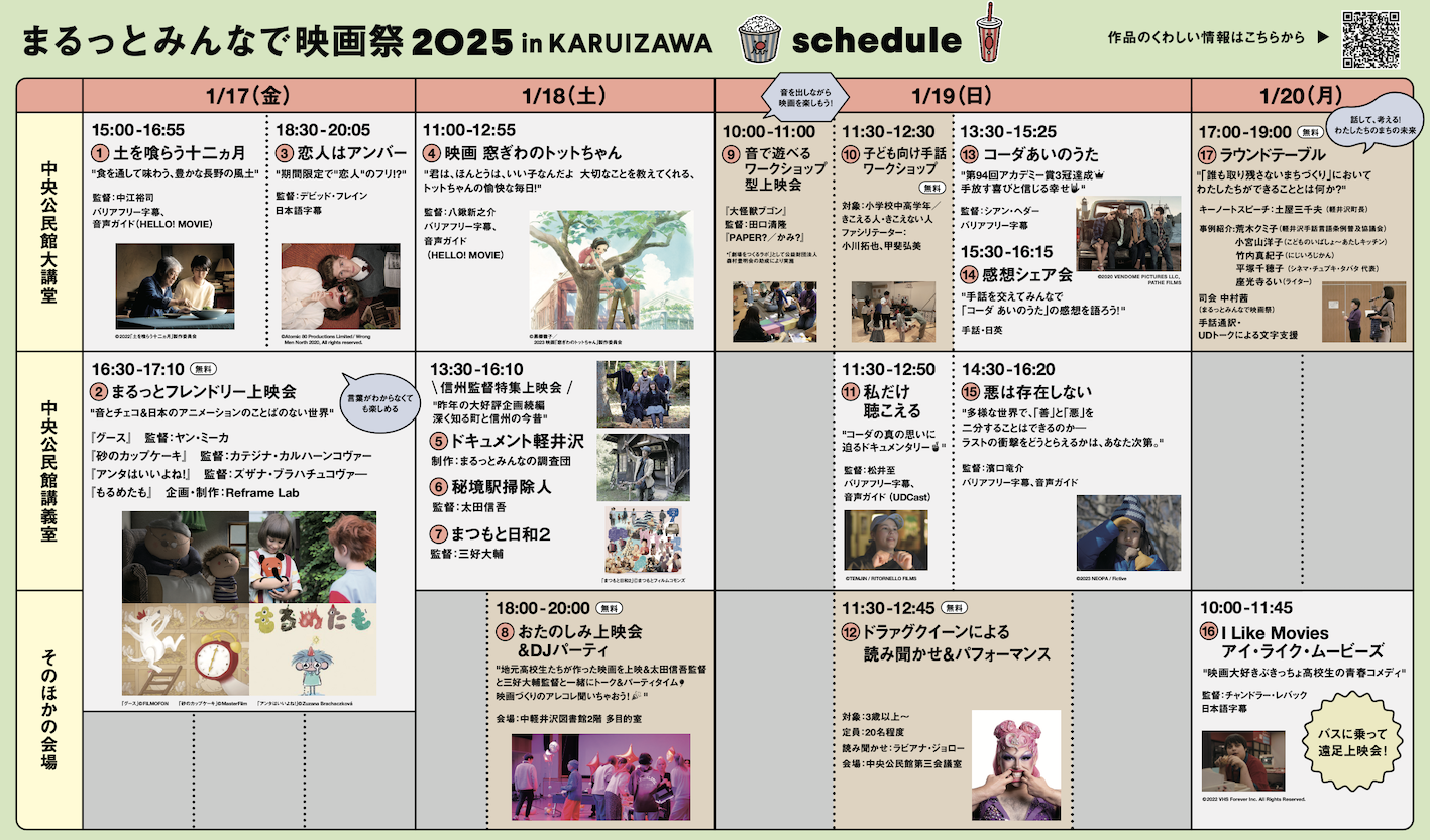 年代や国籍、障害の有無を超え様々な人が楽しめる「まるっとみんなで映画祭 in 軽井沢」が1月17日から20日、町中央公民館などで開かれる。約300人が来場した2023年に続き2回目。映画によって、視聴覚障害のある人のための音声・字幕ガイドや、自由な姿勢で鑑賞を楽しめるリラックスエリアも設ける。