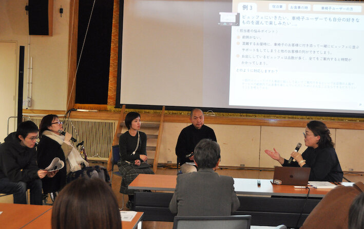 車椅子利用者、聴覚障害者、障がい児の保護者が、宿泊や食事など具体的な場面での有効な対応を伝え、参加者からの質問にも答えた。