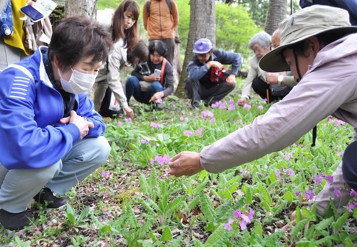 軽井沢町は5月10日、自然環境保全について考えるシンポジウムを開いた。町花のサクラソウをはじめとした希少種の現状や、生物多様性の保全活動などについて3人の専門家が講演し、会場近くでちょうど花をつけ始めたサクラソウも観察した。