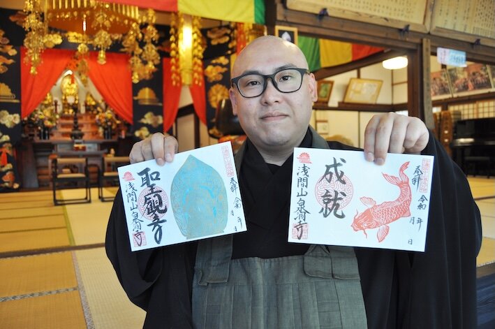 泉洞寺の副住職、4年前から制作 消しゴムはんこの御朱印授与始める