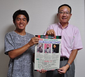 左から番場さんと大井社長。 2011年から毎年、「信州ずくだせ落語会」の前座を務めてきた軽井沢町