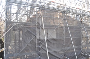 軽井沢高原文庫の中庭に建つ、小説家野上弥生子の書斎の葺き替え工事が4月24日から始まった。建物は