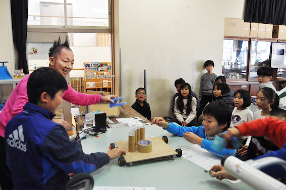 軽井沢中部小学校発明科学クラブの4~6年生18人が11月21日、廃材を使った発明品を発表した。身