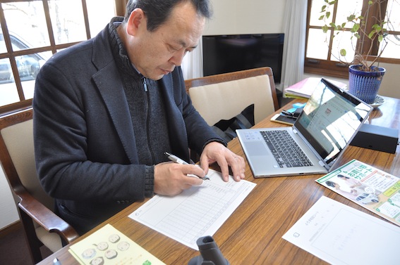 デモンストレーションをする高見さん。ペンで書かれた文字はデータ化され、電話線に繋いだ機器を介して送