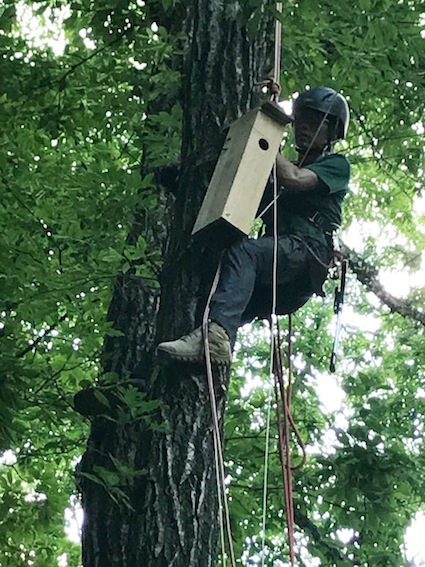 愛宕山の高い木にキツツキのための巣箱を取り付ける 2016年に発足したNPO法人「愛宕山てっぺん