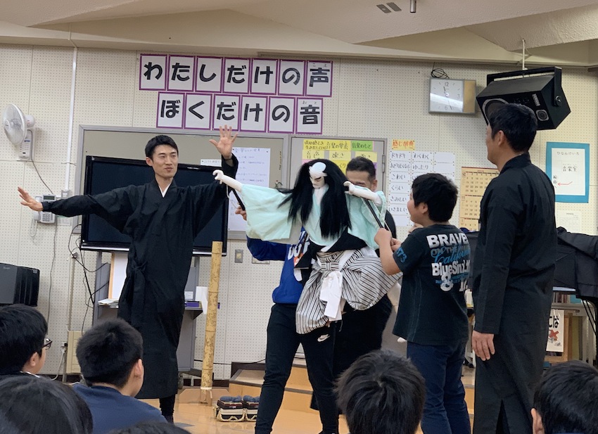 先月、軽井沢東部小学校で行われた文楽教室では子ども達が実際に人形に触れて親しんだ。 子ども達に日