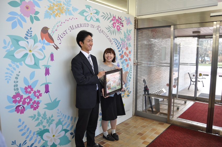 軽井沢のオリジナル婚姻届を手に、パネル前でモデル役を務める役場職員。 軽井沢町役場庁舎の南玄関入