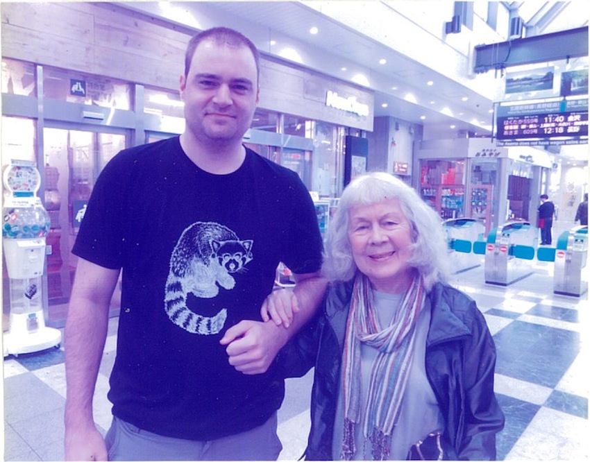 軽井沢駅に到着したハンフリーズさん(右)と孫のサム・リスターさん。(大久保さん提供) 明治期に日