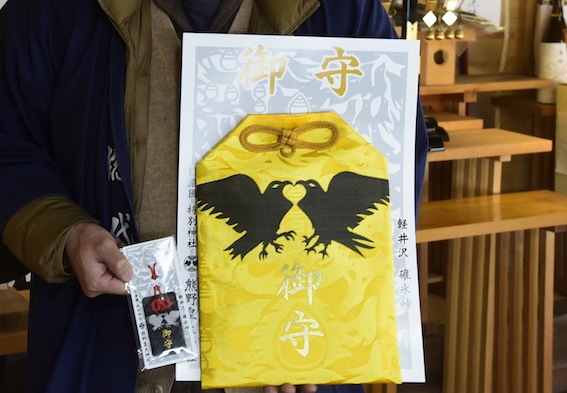 通常のお守りの約28倍の特大お守り。初穂料5000円。 長野県・群馬県の県境に位置する熊野皇大神