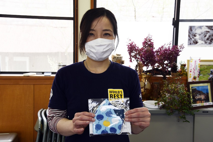 マスクを持つ岡村真知子さん。マスクは日本各地へ発送している。大人から子どもまで使えるように7サイズ