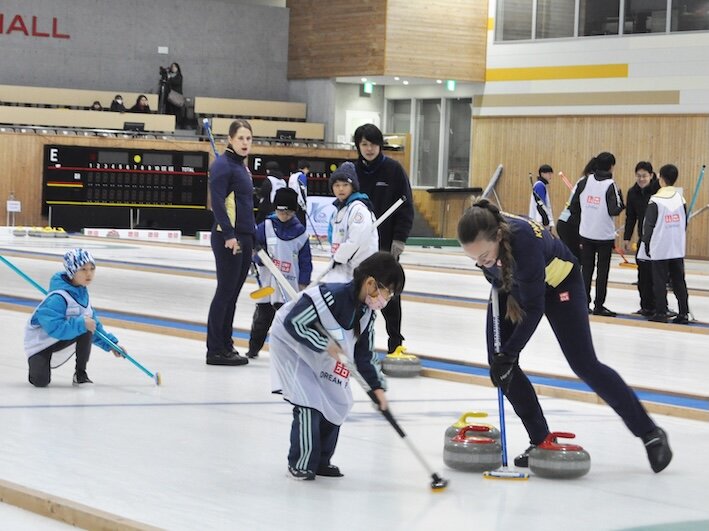 軽井沢国際カーリング選手権出場の世界トップチームの選手が、子どもたちを指導する「ジュニアカーリン